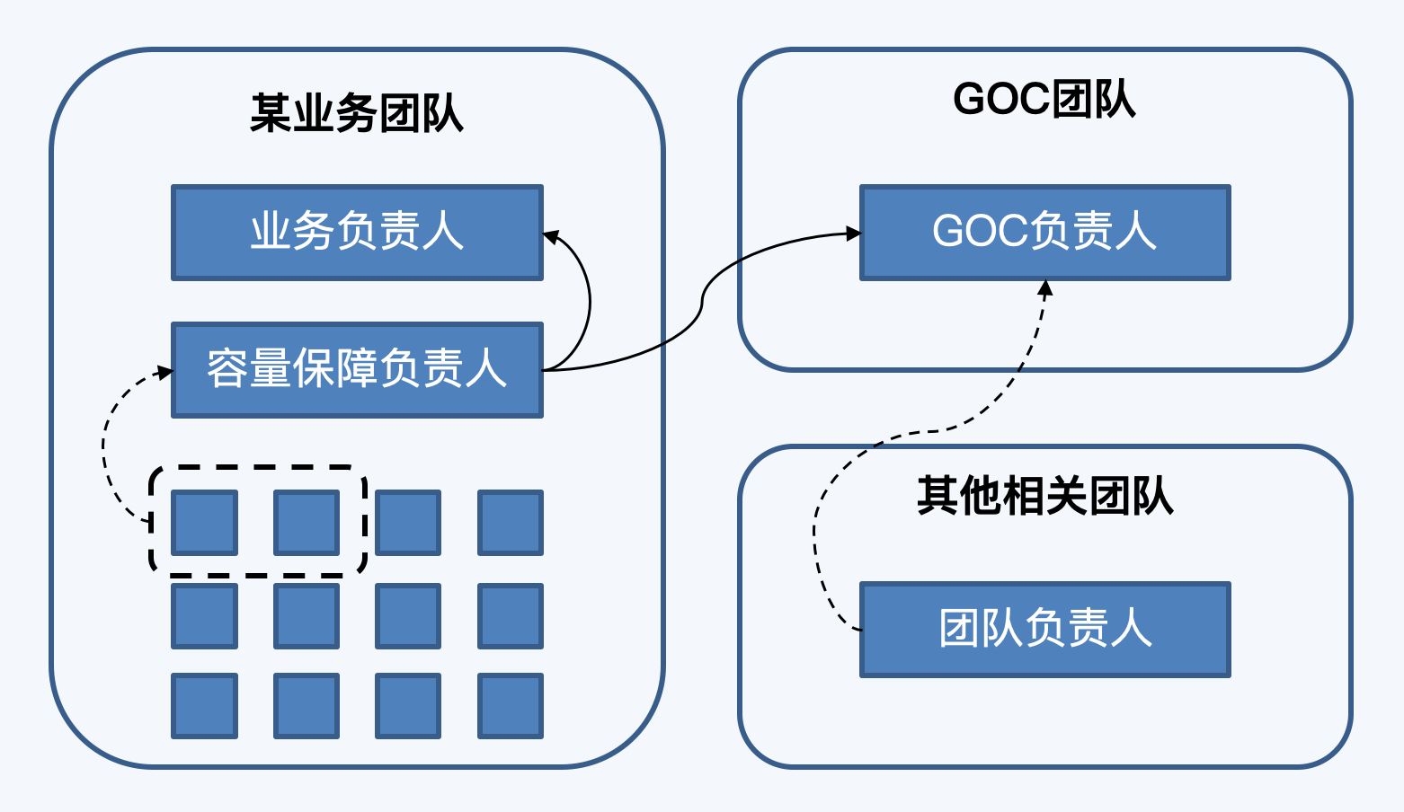 在我的实际工作经验中,为了让容量保障团队更有抓手,采用过“虚实结合”的方式。每个业务技术团队确保有一个容量保障负责人,可以是架构师或资深研发人员,他们分别向业务负责人和GOC负责人双实线汇报,定义明确的目标和产出。