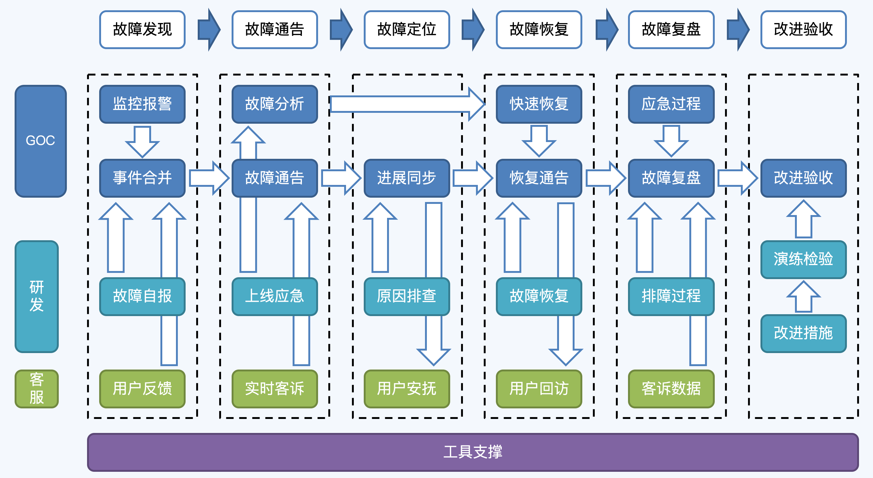 如下图所示,我们以容量故障的线上应急为例,看一下GOC团队是如何与研发团队和客服团队联动工作的。