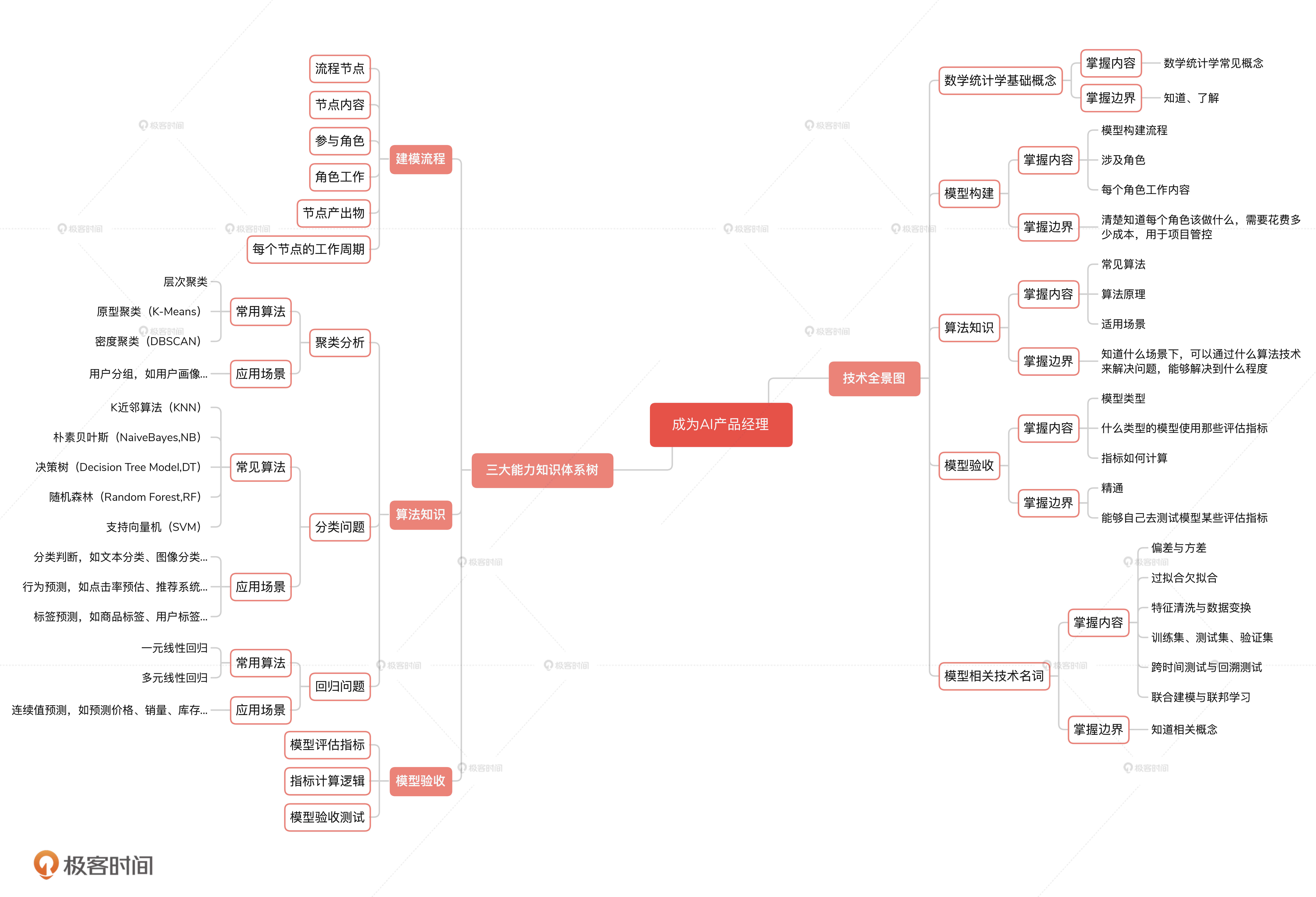 我也按照常用的算法分类方式,把一些常用算法整理在了脑图里。因为算法是未来你区别于普通产品经理的重要抓手,所以我后面会花一整个章节来为你讲解当前主流的算法。