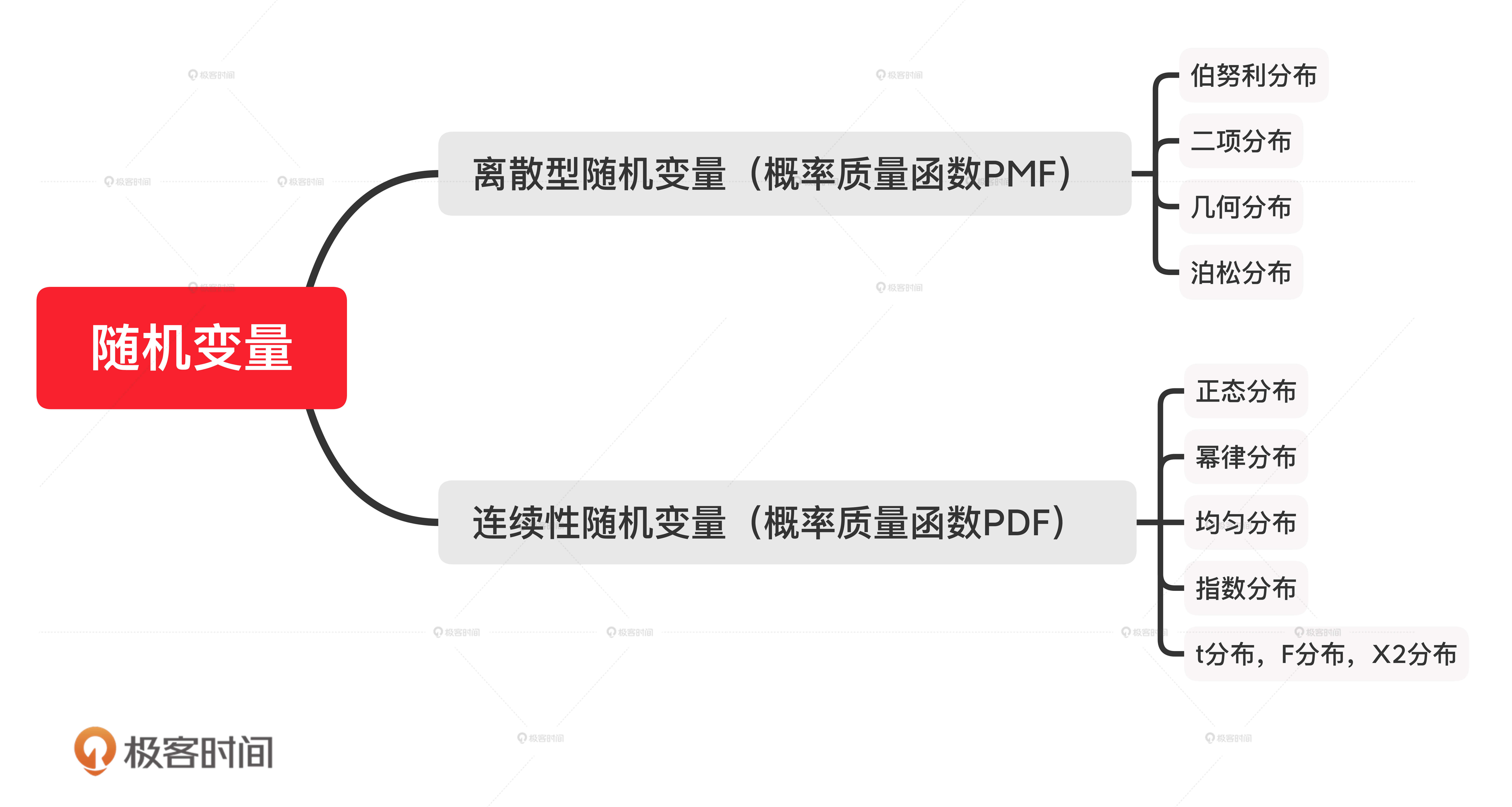 因为概率的分布和随机变量的类型相关,随机变量又可以分为离散型随机变量和连续性随机变量两种。为了方便你查看,我把这两种变量对应的概率分布的类型都总结在了下面这张图里。
