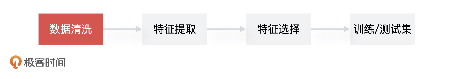 这里我要补充一点,在建立特征工程的开始阶段,算法工程师为了更好地理解数据,通常会通过数据可视化(Data Visualization)的方式直观地查看到数据的特性,比如数据的分布是否满足线性的?数据中是否包含异常值?特征是否符合高斯分布等等。然后,才会对数据进行处理,也就是数据清洗,来解决这些数据可能存在的数据缺失、有异常值、数据不均衡、量纲不一致等问题。