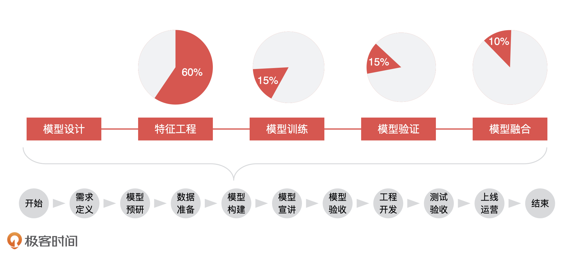 说了这么多,其实核心就是一句话:数据和特征决定了机器学习的上限,而模型和算法只是逼近这个上限而已。因此,算法工程师们花费在特征工程建立上面的时间,基本上占整个模型构建的 60%。