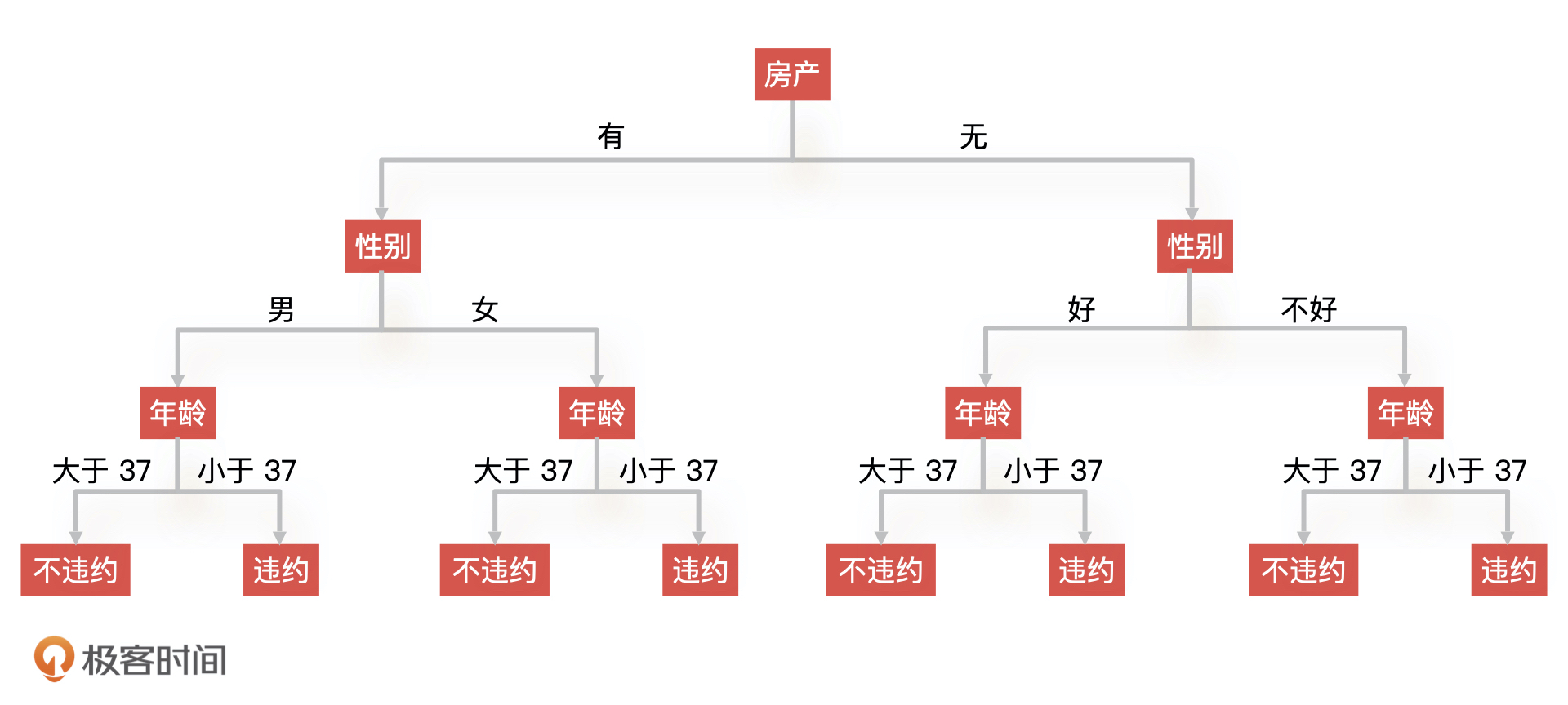 假设年龄在 37 的时候 Gini 系数最小,等于 0.511,那么年龄这个特征的条件分支就是小于 37 和大于 37。