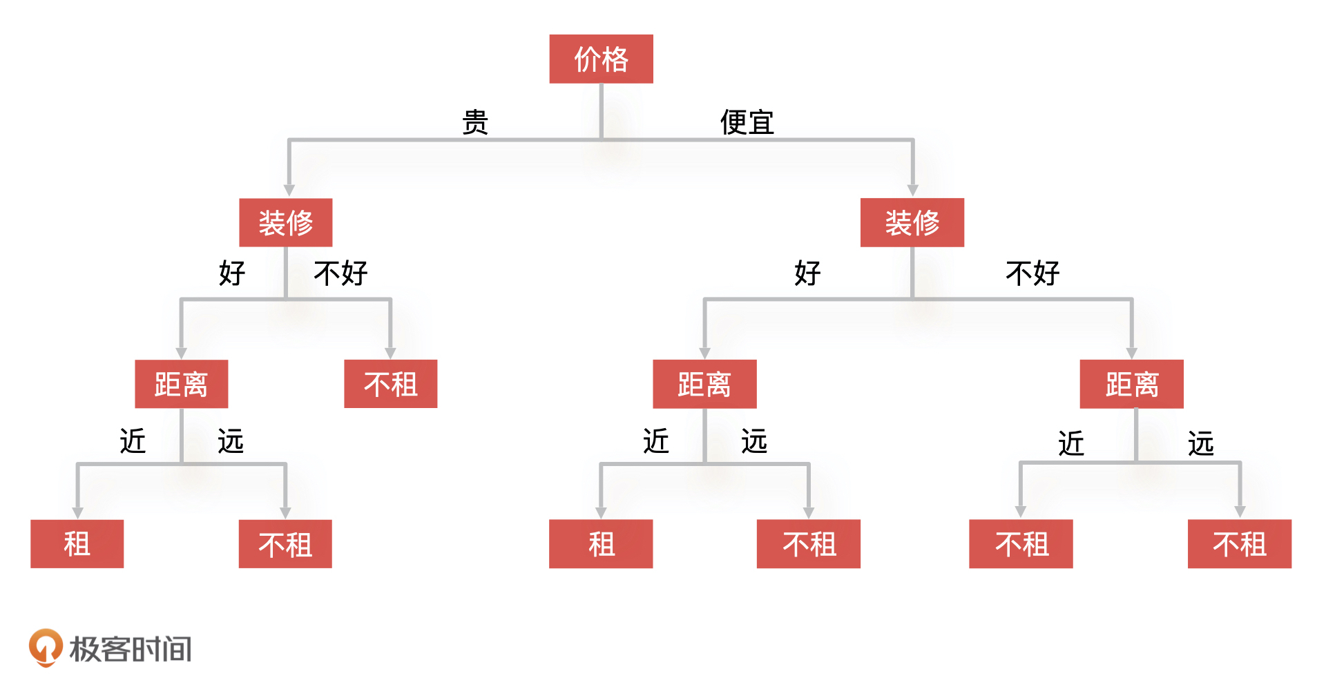 你会发现,我们的决策树一下子变“大”了,判断这个房子的过程就变成了,先看价格,再看装修,最后看距离。我们发现,即使决策树的结构发生了变化,可我们还是会得到之前的结论:不租,所以,决策树的构造只会影响到算法的复杂度和计算的时间,而不会影响决策的结果。