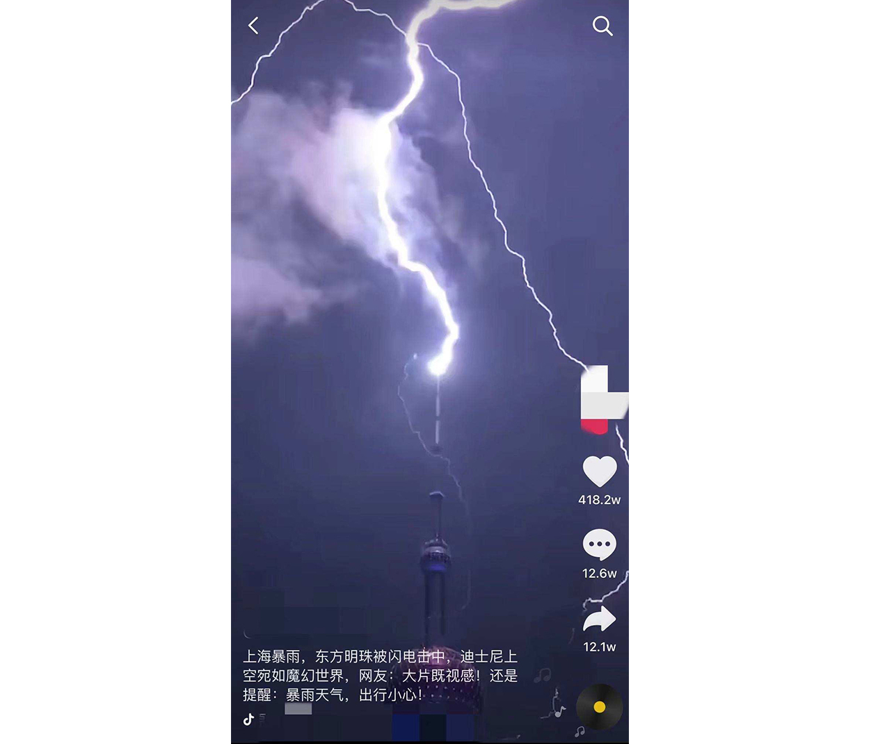 我给你举个例子。有一位创作者发布了上海东方明珠高塔被雷电击中的视频,这显然是典型的戏剧性开场,在结尾时创作者将高塔被雷电击中的一刻做成了定格图片,从而再次深化了内容的主题,起到了震撼人心的作用。
