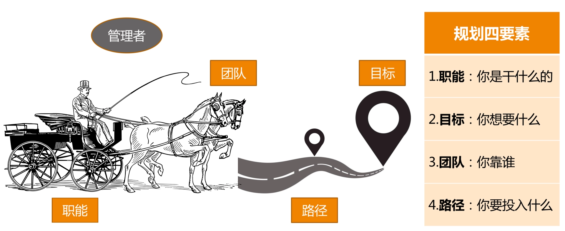至此,我们已分别探讨了管理规划的四个要素,对应明确回答了下面这四个问题: