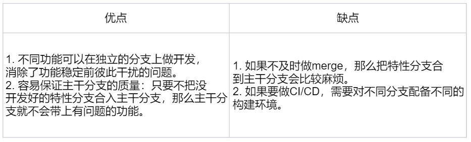 通过Git Flow、GitHub Flow和 GitLab Flow(3个衍生类别) 这几个具体模型的介绍,我给你总结一下特性分支开发的优缺点。如表3所示。