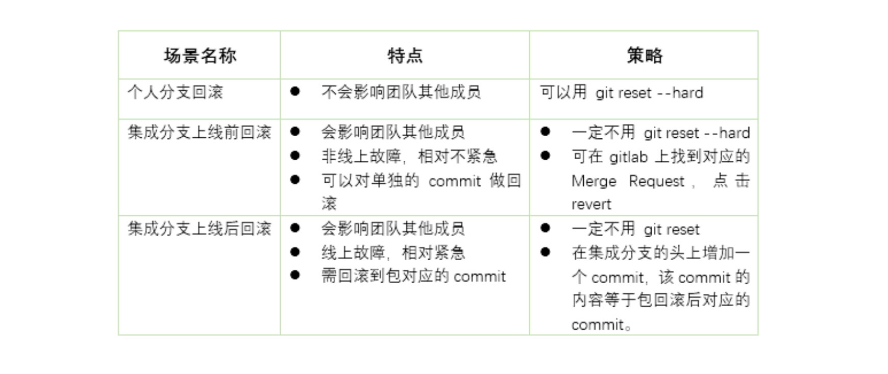 线上产品包已经回滚到昨天的版本了,我清清楚楚地记得昨天我把发布分支上的代码也reset –hard到对应的commit了,怎么那几个有问题的commit今天又带到发布分支上了?真是要命!- 答:集成分支不能用 reset –hard 做回滚,应该采用集成分支上新增commit的方式达到回滚的目的。