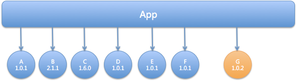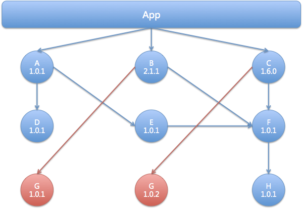一个App中的两个组件B和C都依赖了组件G,但依赖的却是组件G的不同版本。所以,这个组件G的2个版本间就发生了冲突。