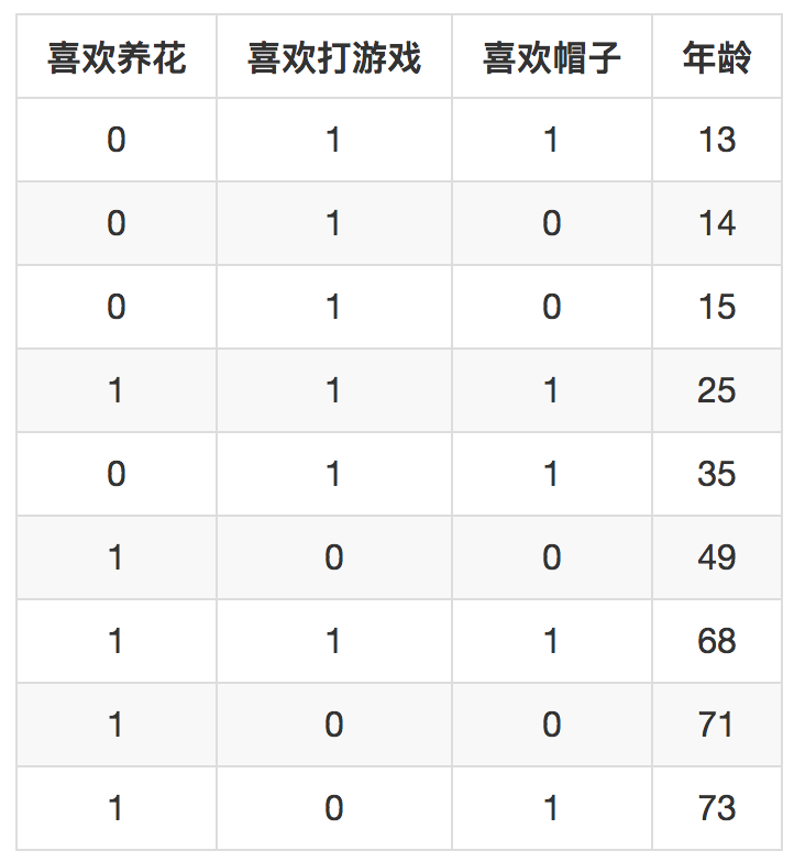 现在有个任务是根据是否喜欢养花,喜欢打游戏,喜欢帽子来预测年龄,模型就是梯度提升决策树GBDT。假设我们设定好每个子树只有一层,那么三个特征各自按照取值都可以构成两分支的小树枝。