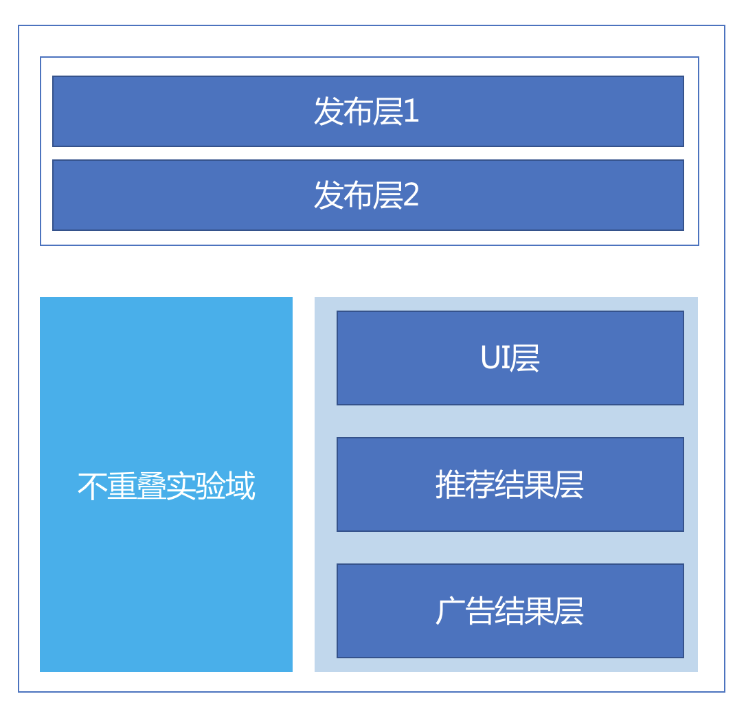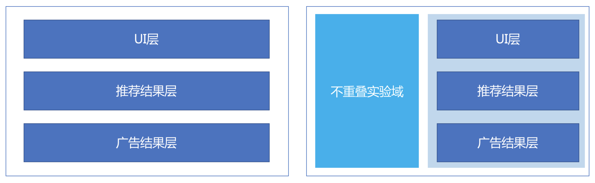 三层互不影响。图中的右边则添加了域划分,也就是不再是全部流量都参与实验中,而是被分走了一部分到左边域中。剩下的流量和左边的实验一样。