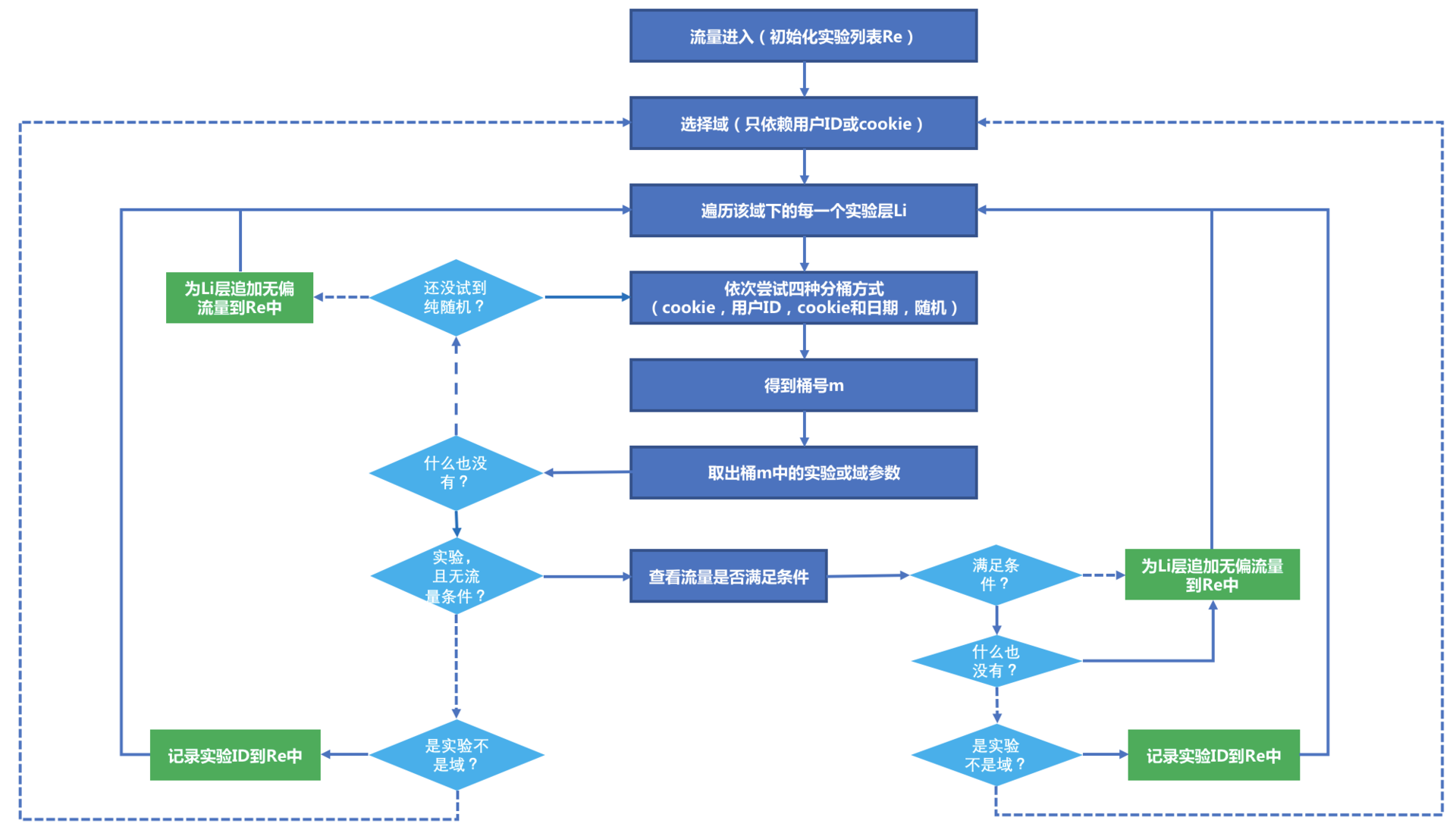 在Google的架构中,由于层和域还可以嵌套,所以在进入某个层时,可能会遇到一个嵌套域,这时候需要按照域划分方式继续下沉,直到遇到实验或者被作为回收流量返回。整个实验平台,工作的示意图如下所示: