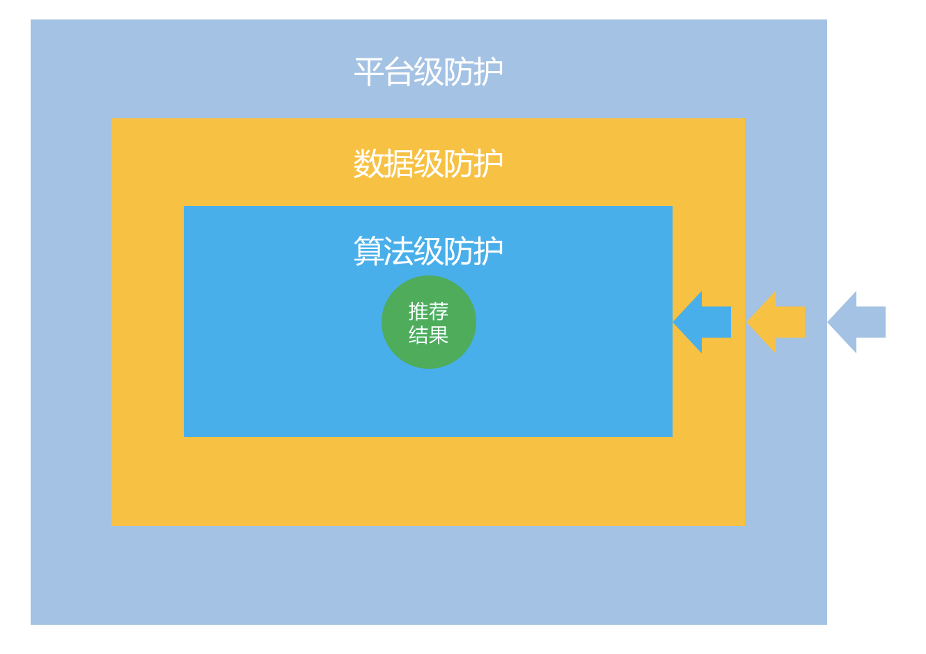 将上述三个层级的防护表示如下图更清楚些,核心要保护推荐结果符合平台方的利益。