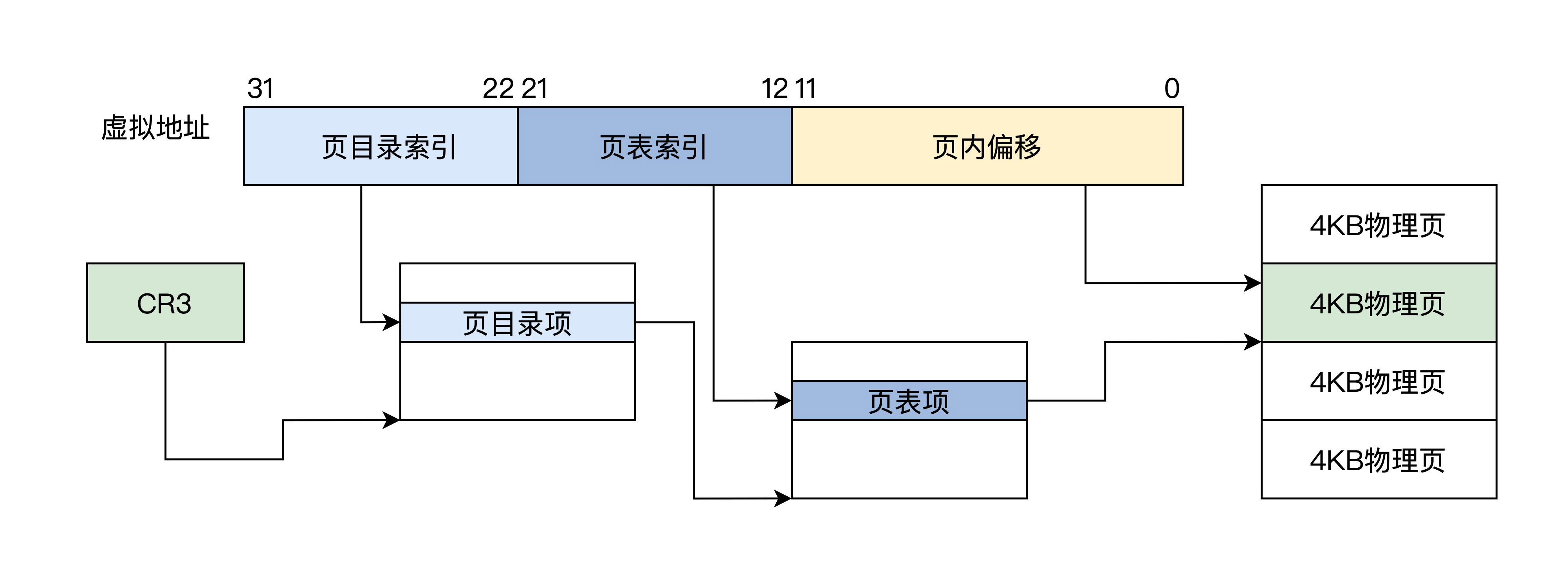 该分页方式下,32位虚拟地址被分为两个位段:页表索引、页内偏移,只有一级页目录,其中包含1024个条目。其中一个条目指向一个物理页,每个物理页4MB,正好为4GB地址空间,如下图所示。