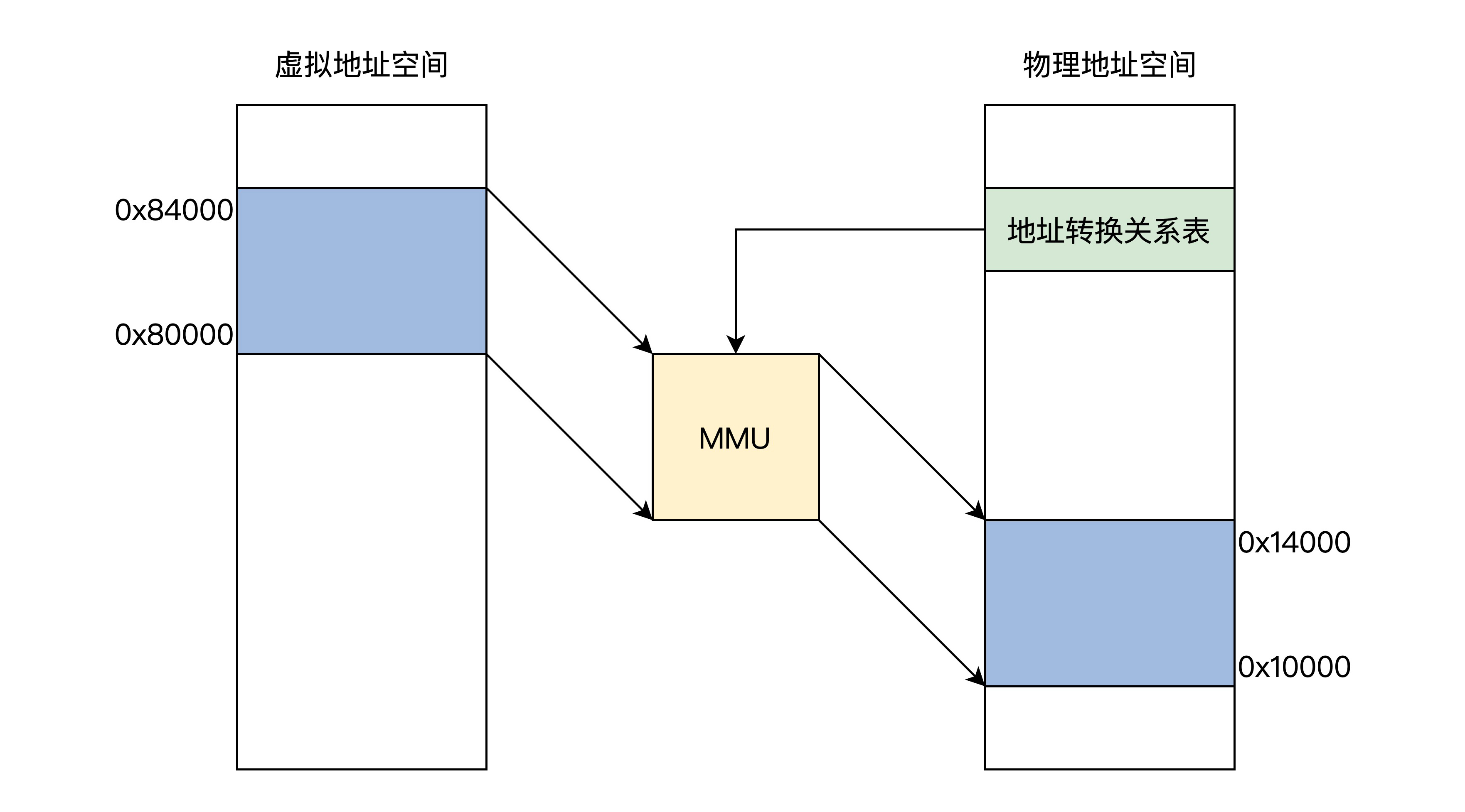 上图中展示了MMU通过地址关系转换表,将0x80000~0x84000的虚拟地址空间转换成 0x10000~0x14000的物理地址空间,而地址关系转换表本身则是放物理内存中的。
