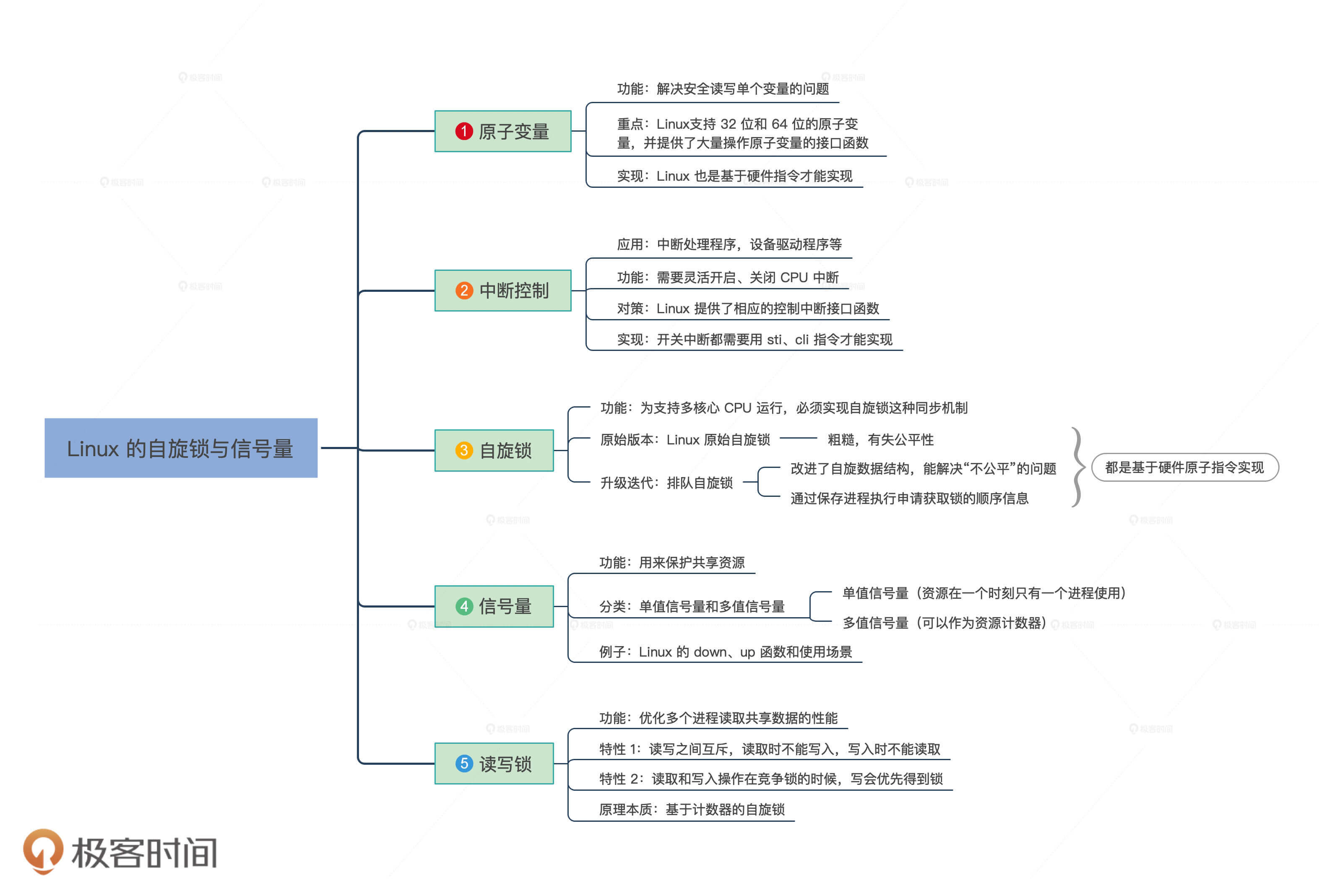 好了,这节课的内容讲完了。我们一起学习了Linux上实现数据同步的五大利器,分别是Linux原子变量、Linux中断控制、Linux自旋锁、Linux信号量、Linux读写锁。我把重点给你梳理一下。