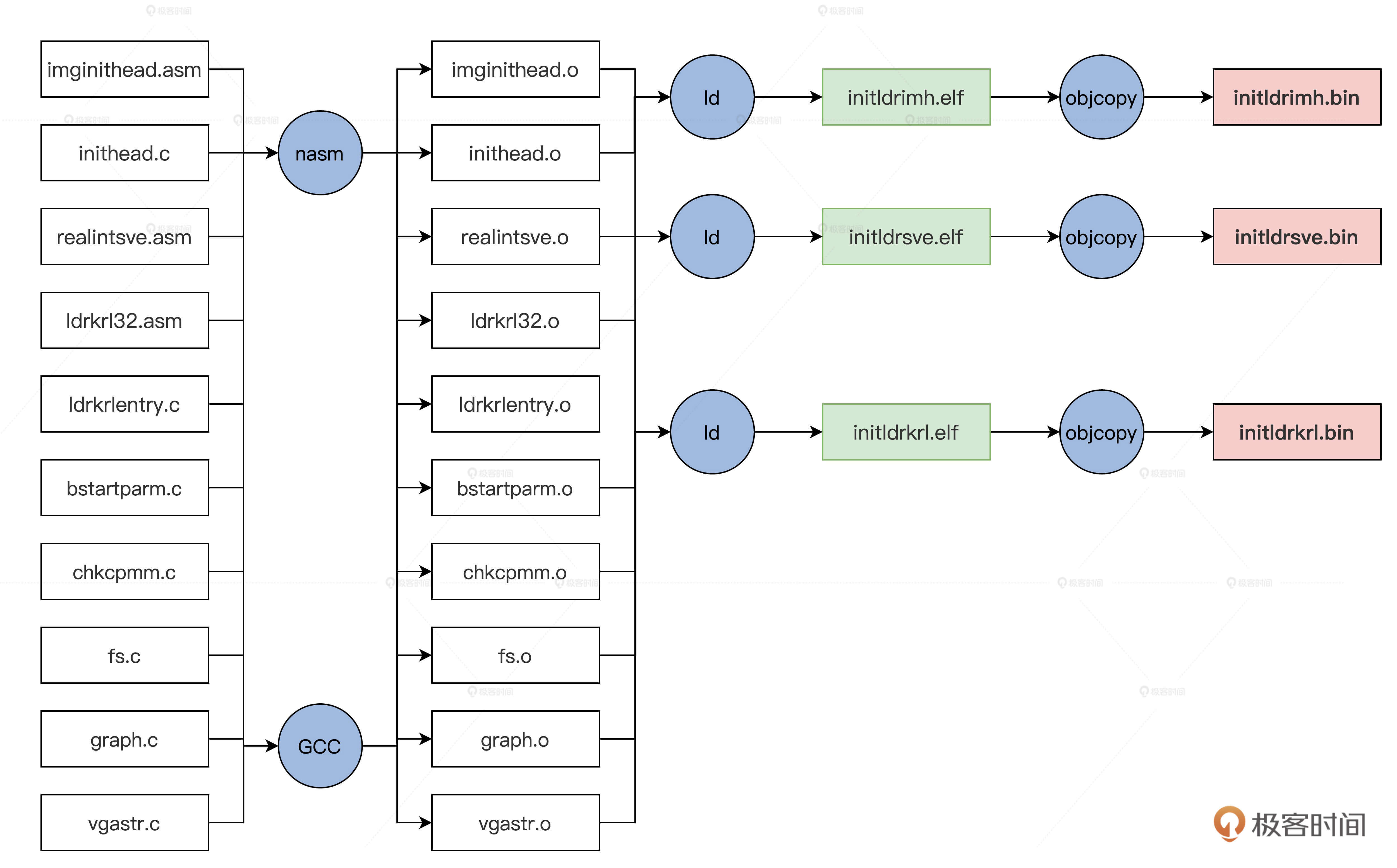 上述这些文件都在lesson10~11/Cosmos/initldr/ldrkrl目录中,它们在编译之后会形成三个文件,编译脚本我已经写好了,下面我们用一幅图来展示这个编译过程。
