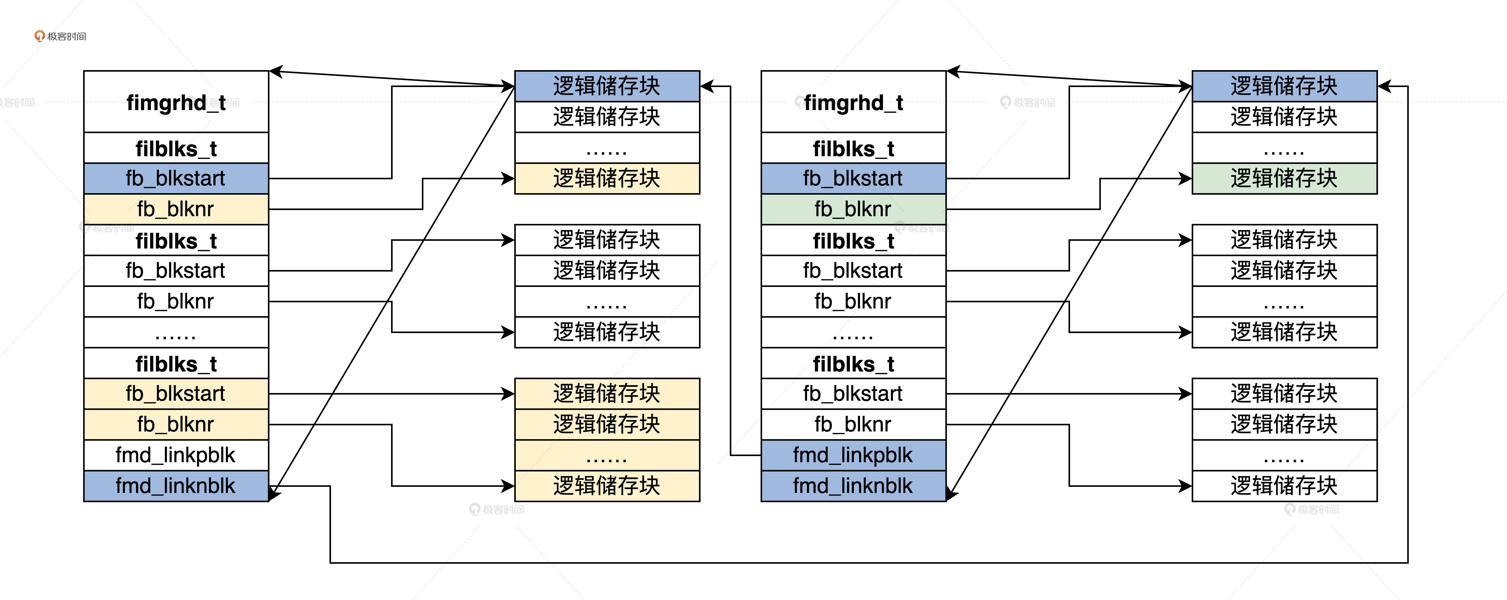 fimgrhd_t结构中,其它的信息都比较易懂,关键是fmd_fleblk数组,它里面的每个元素都保存一片连续的逻辑储存块。