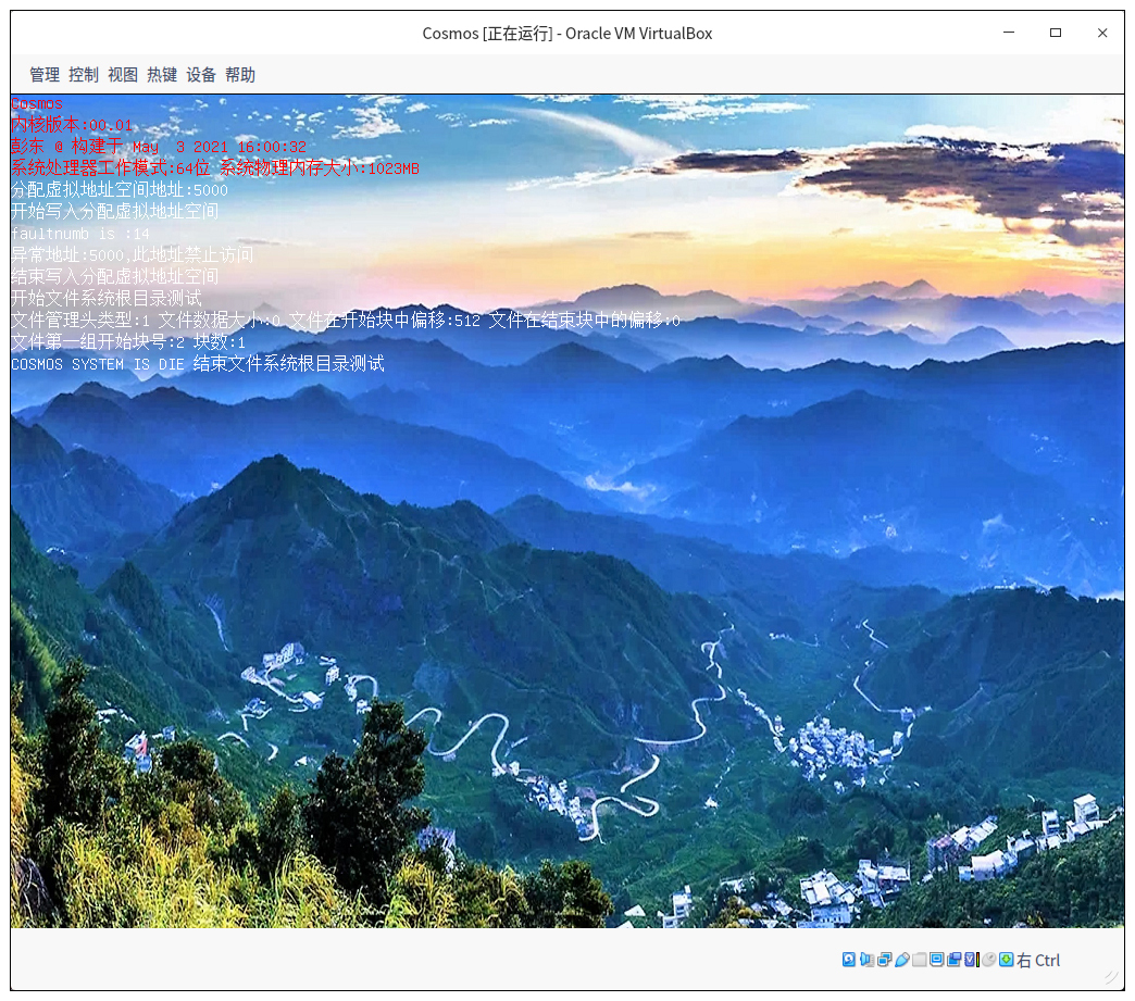 test_rfs_rootdir函数同样要在rfs_entry函数的末尾调用,然后我们在终端下执行make vboxtest,就可以看到cosmos加载rfs驱动程序运行后的结果了。