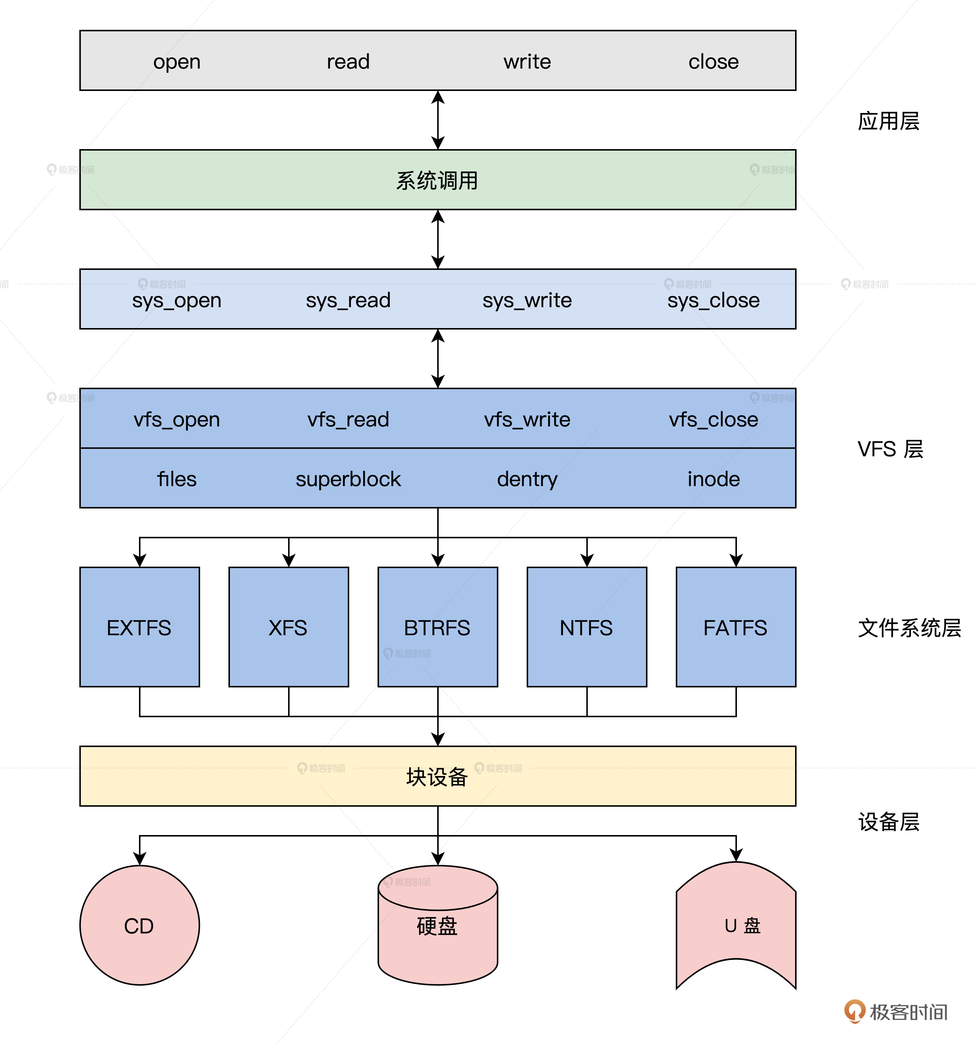 你有没有发现,在计算机科学领域的很多问题,都可以通过增加一个中间的抽象层来解决,上图中Linux的VFS层就是应用和许多文件系统之间的抽象层。VFS向上对应用提供了操作文件的标准接口,向下规范了一个文件系统要接入VFS必需要实现的机制。