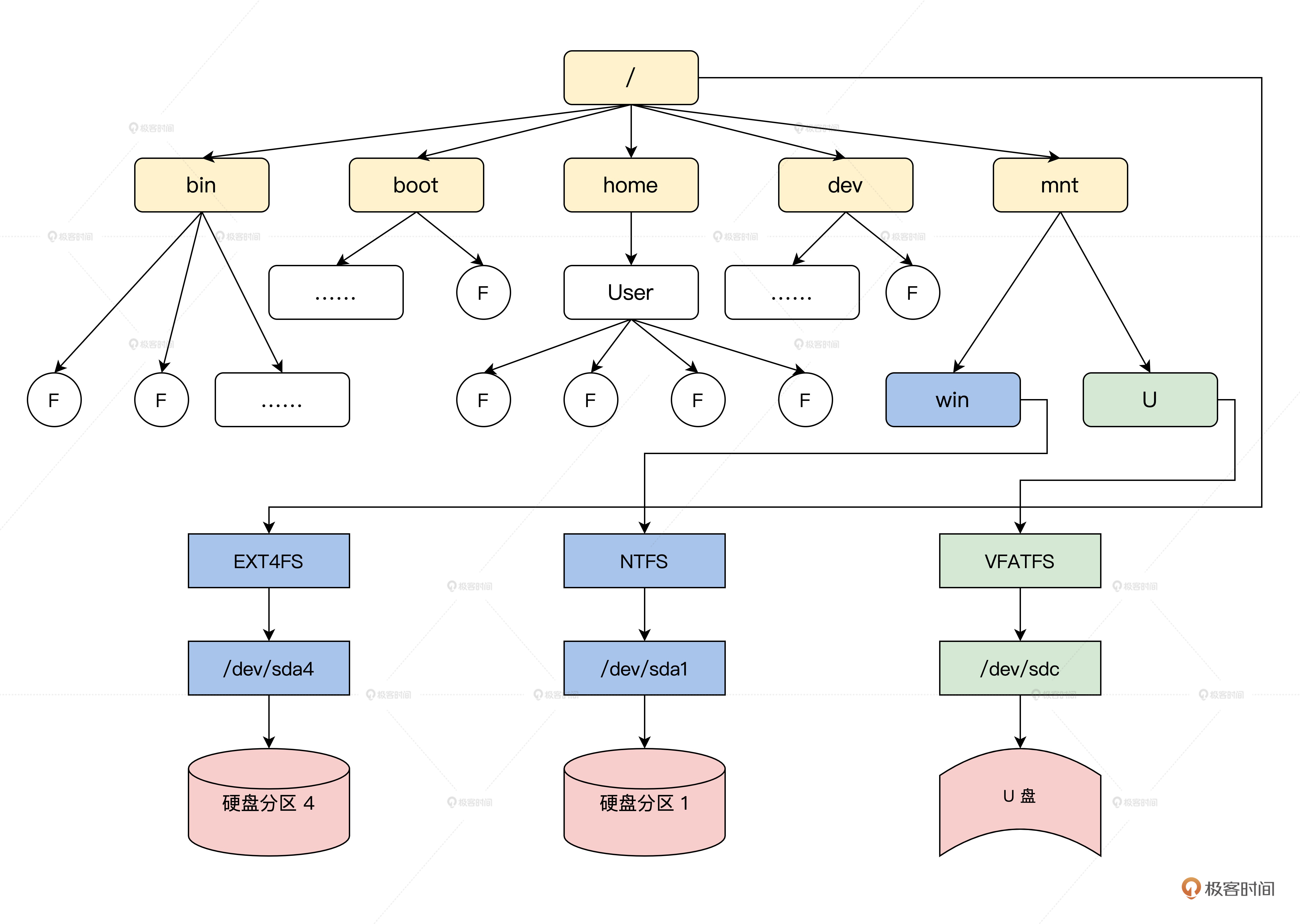 在Linux中,支持EXT、XFS、JFS、BTRFS、FAT、NTFS等多达十几种不同的文件系统,但不管在什么储存设备上使用什么文件系统,也不管访问什么文件,都可以统一地使用一套open(), read()、write()、close()这样的接口。