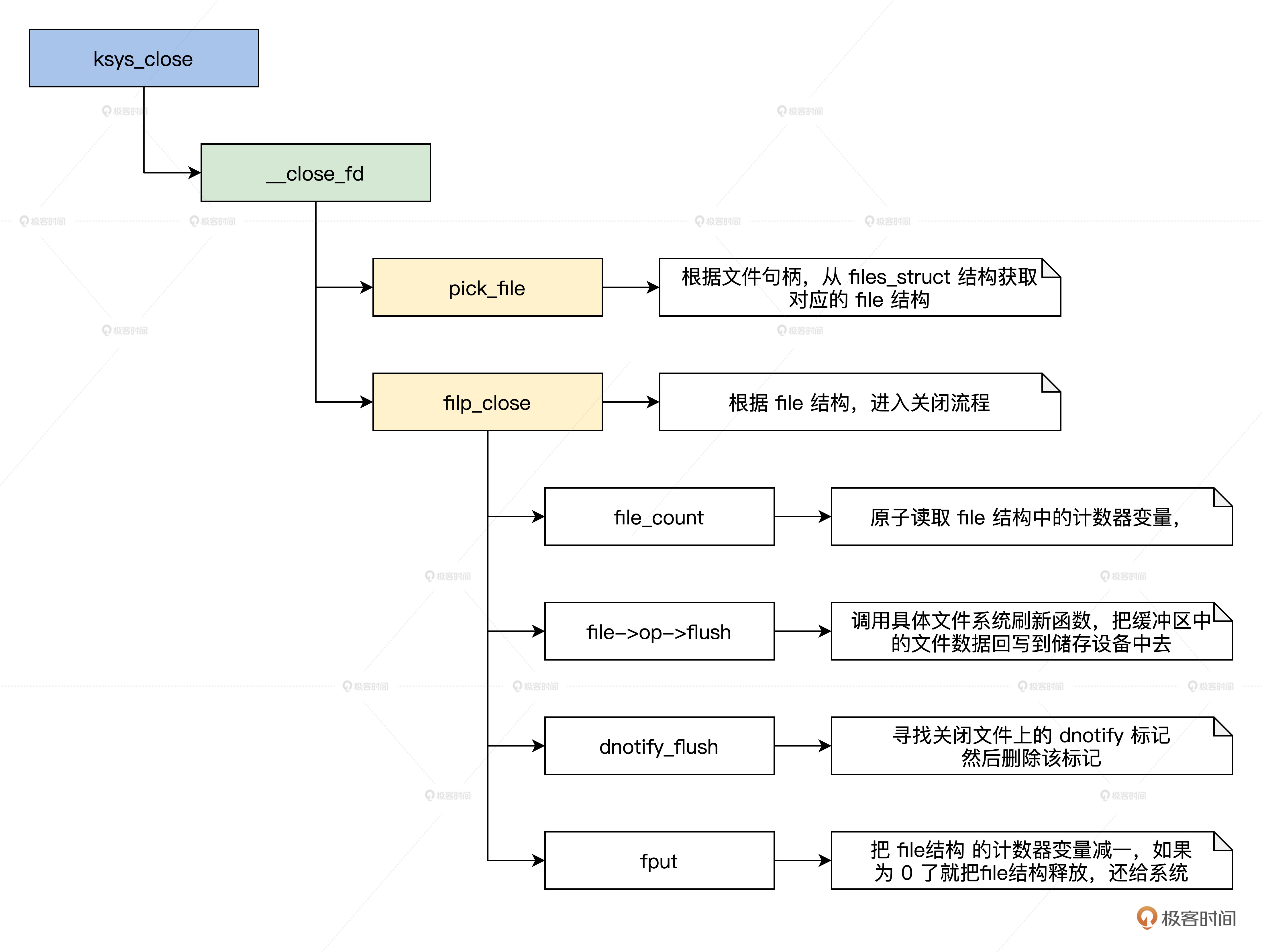 下面我们就来看看关闭文件的操作流程,我同样用画图的方式为你展示这一流程,如下所示。