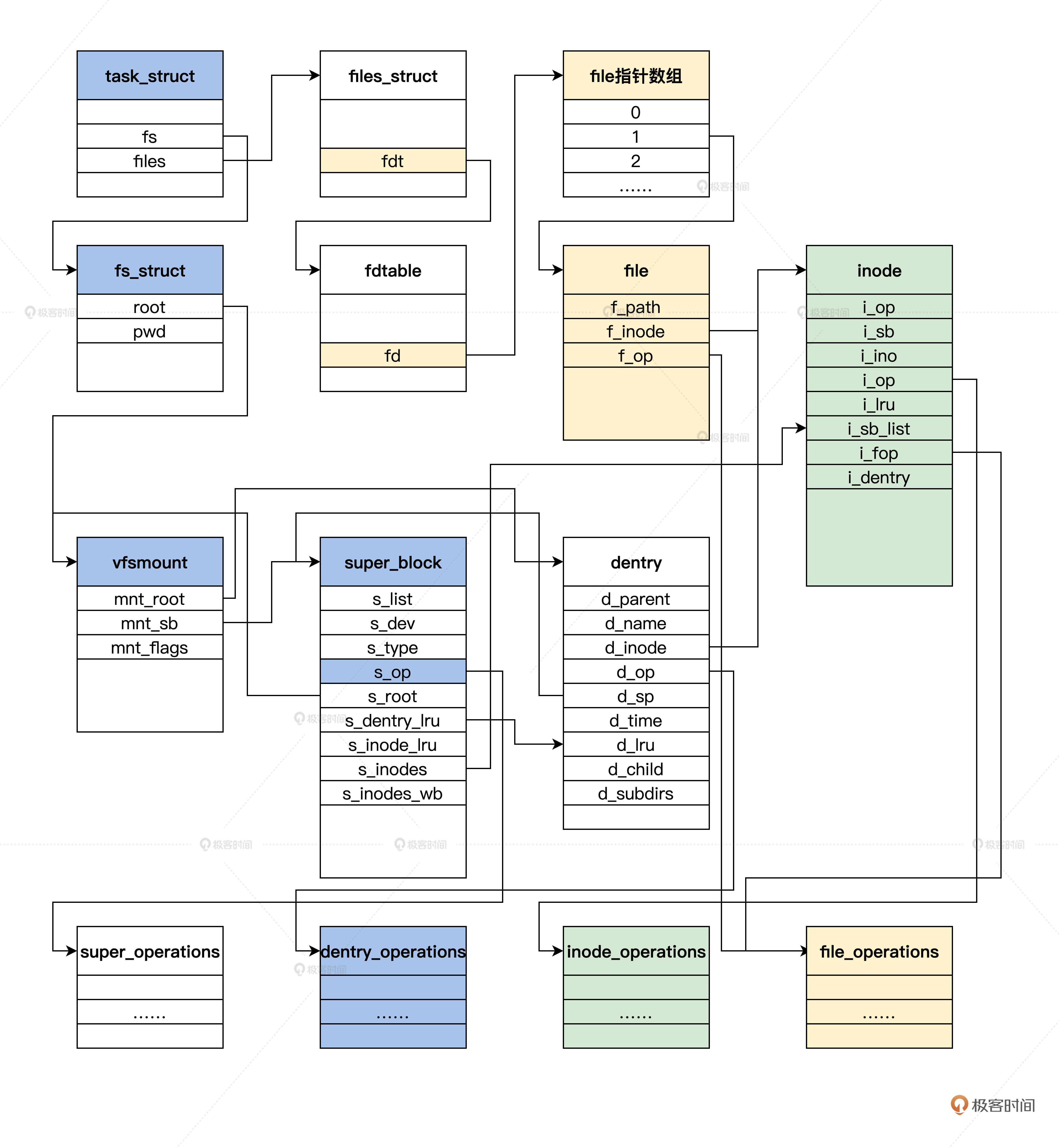 上图中展示了spuer_block、dentry、inode、file四大结构的关系,当然这只是打开一个文件的情况,如果打开了多个文件则相应的结构实例就会增加,不过底层逻辑还是前面图里梳理的这样,万变不离其宗。