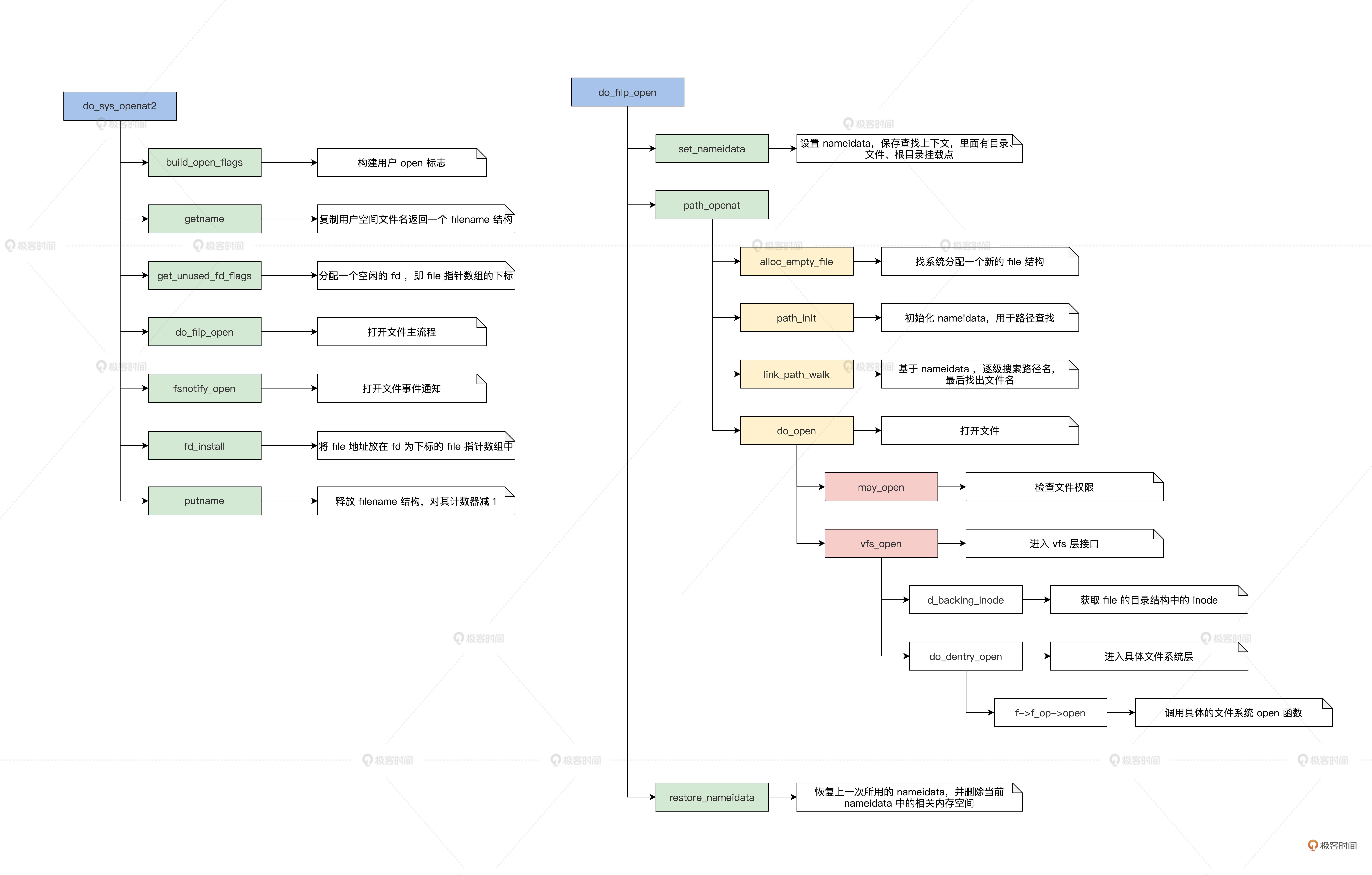 上图中展示了读文件操作的函数调用流程,写文件操作的流程和读文件操作的流程一样,只是数据流向不同,我就不展开了,你可以自己想一下。