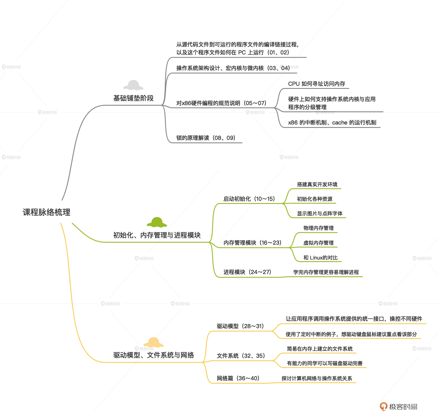 这里我整理了一张导图,整理了课程脉络。这里先说明一下,课程里还有不少关于Linux的内核的分析,这里为了凸显Cosmos主线我没有过多涉及Linux,如果你有兴趣可以试着自己动手总结归纳。
