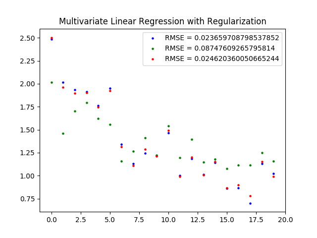 在编程中,很多第三方的Python库都可以直接实现不同的正则化处理。在Scikit-learn库中,线性模型模块linear_model中的Lasso类和Ridge类就可以实现\(l_1\)正则化和\(l_2\)正则化。使用这两个类对上一篇文章中拟合出来的多元线性回归模型进行正则化处理,将两种算法中的正则化项参数均设置为\(\\lambda = 0.05\),就可以得到修正后的结果: