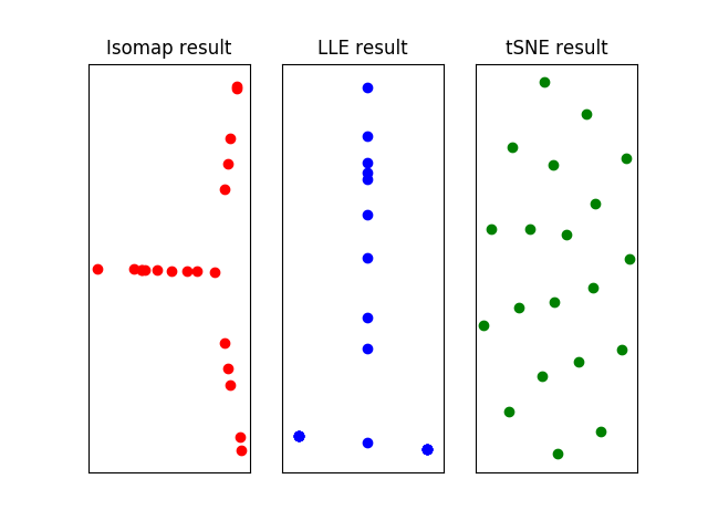 用以上算法将多元线性回归的英超数据集投影到二维流形上,由于数据集中的数据点较少,各种算法中近邻点的数目都被设置为2个,得到的结果如下。可以看出,三种方式计算出的流形中似乎都存在这一些模式,但说明这些模式的意义可就不像将它们计算出来那么简单了。
