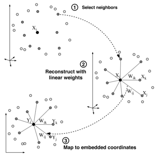 图A表示为数据点\(X_i\)选择近邻点,图B表示将\(X_i\)表示为近邻点的线性组合并计算系数\(W_{i \\cdot}\),图C表示保持\(W_{i \\cdot}\)不变重构数据点\(Y_i\),图片来自Nonlinear dimensionality reduction by locally linear embedding, Science, vol. 290, 2323-2326