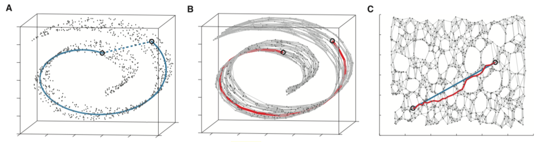 图A表示测地距离与欧氏距离的区别,图B表示利用近邻点近似计算测地距离,图C表示真实测地距离与近似测地距离的比较,图片来自A global geometric framework for nonlinear dimensionality reduction, Science, vol. 290, 2319-2323