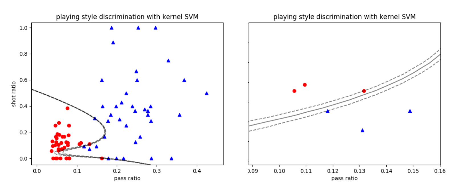 使用径向基核的支持向量机对曼城-西布朗数据集的分类结果