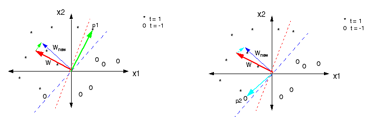 要让这个点被正确分类,原始的系数向量\(w\)就要和向量p1与学习率的乘积相加,其几何意义就是向p1接近,移动的结果就是图中的\(w_{new}\)。