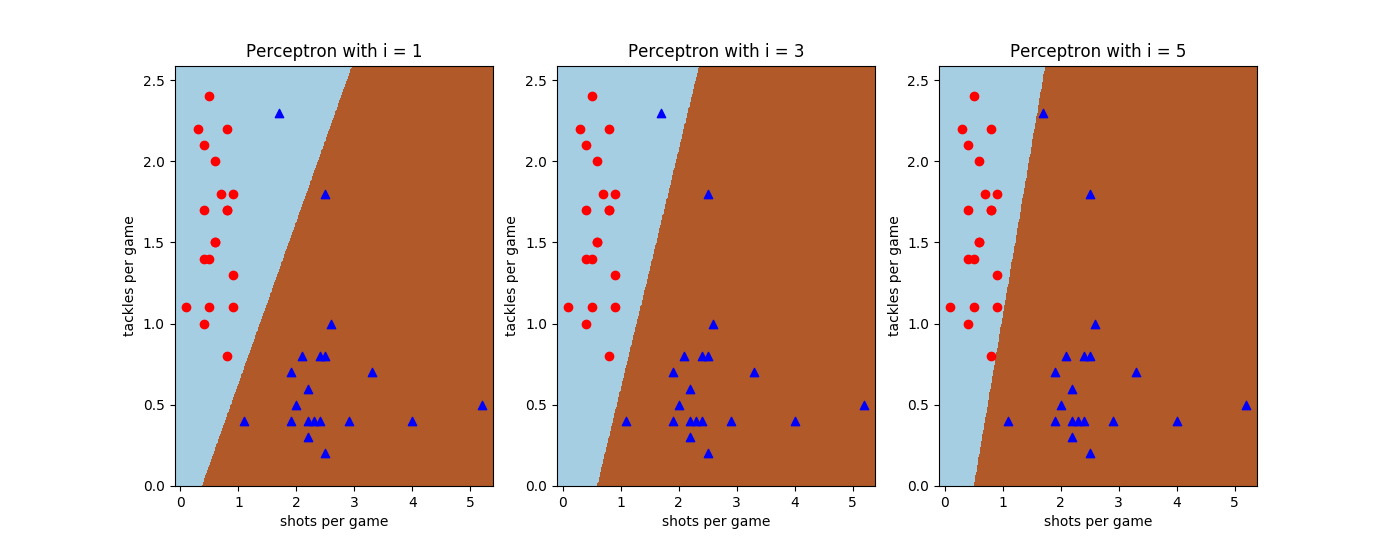 在Scikit-learn中,实现感知器的类Perceptron属于线性模型模块linear_model,这样设置的原因无疑在于感知器本身属于线性判别模型。由于前面使用的中锋-中卫数据集是个线性可分的数据集,因此可以用感知器来进行分类。