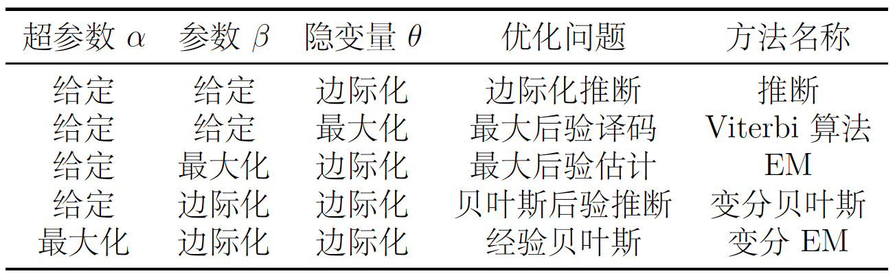 表格的第一行给出了最简单的情形:当问题超参数和参数全部给定时,相当于用确定的模型来估计隐变量,这种对隐变量的预测就是典型的推断问题。具体的实现方式是前向-后向算法(forward-backward algorithm),如果对前向-后向算法进行近似处理,就可以得到变分推断(variational inference)。
