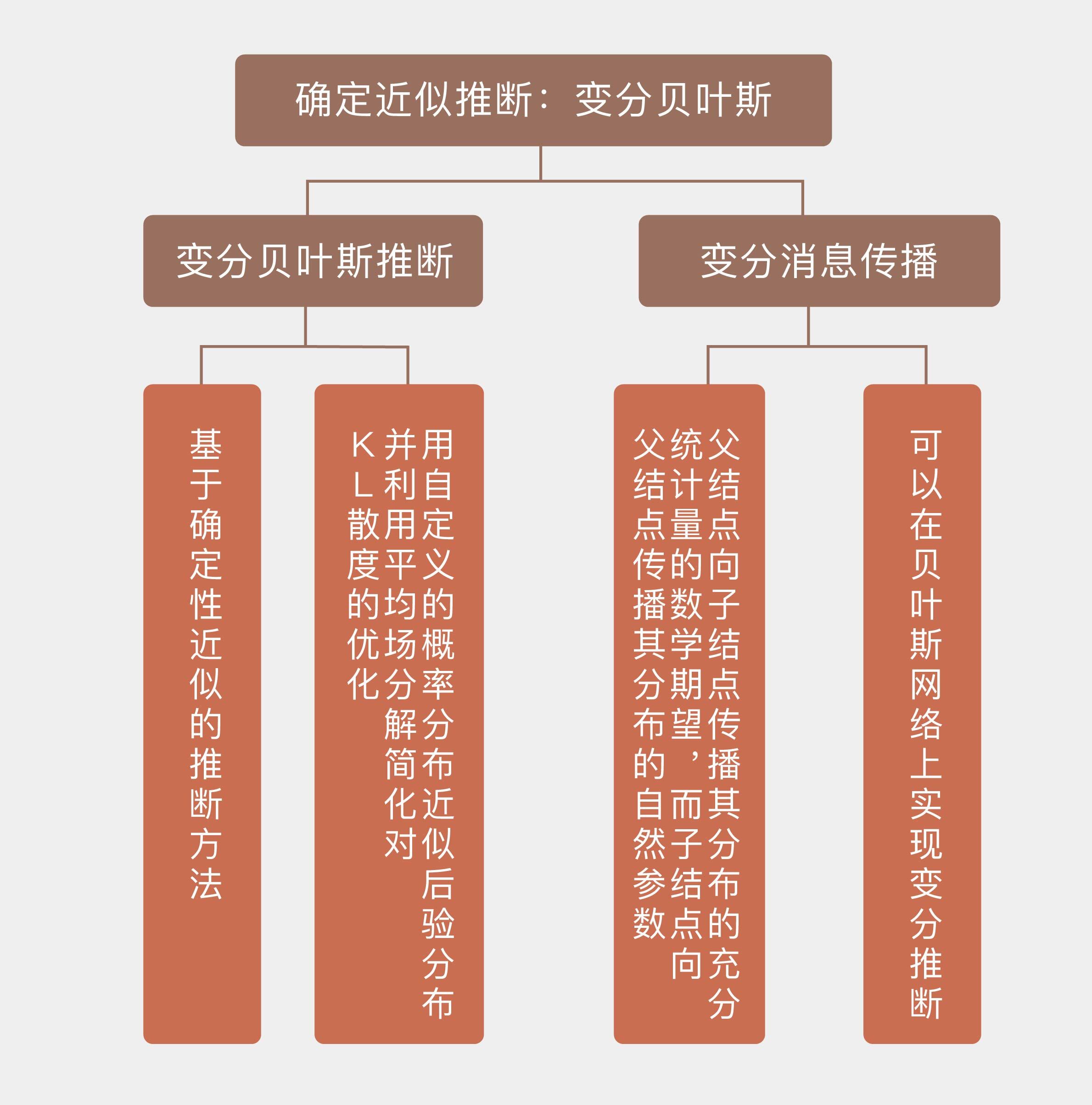 确定性近似的典型代表是变分贝叶斯推断(variational Bayesian inference),它解决的问题是对隐变量\(\\bf y\)关于已知输入\(\\bf x\)的后验概率\(p({\\bf y} | {\\bf x})\)的近似,近似的方式是利用最优的近似概率分布\(q({\\bf y})\)来逼近\(p({\\bf y} | {\\bf x})\)。