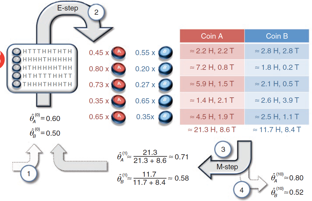 隐变量未知时,利用EM算法求解参数(图片来自What is the expectation maximization algorithm?)