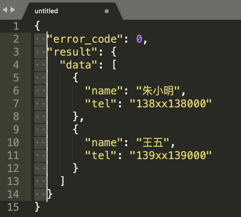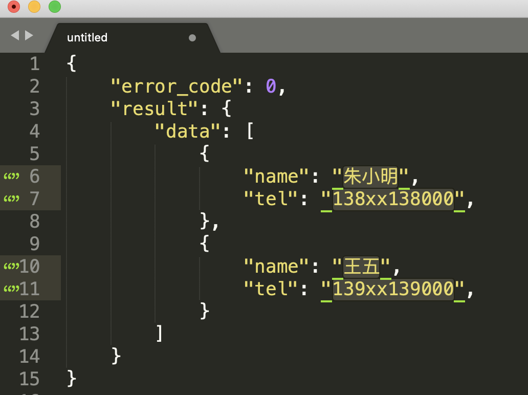 这个特性结合光标移动,可以快速提取某些内容,比如提取 JSON中的姓名和手机号。选中所有的字段和值之间的字符(”: “) 之后,按住 Shift+Alt(macOS上是Shift + Option),用箭头移动光标,可以快速选择到另外一个引号前,然后剪切,再找个空白地方粘贴就可以了。
