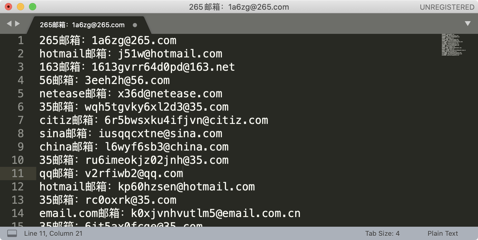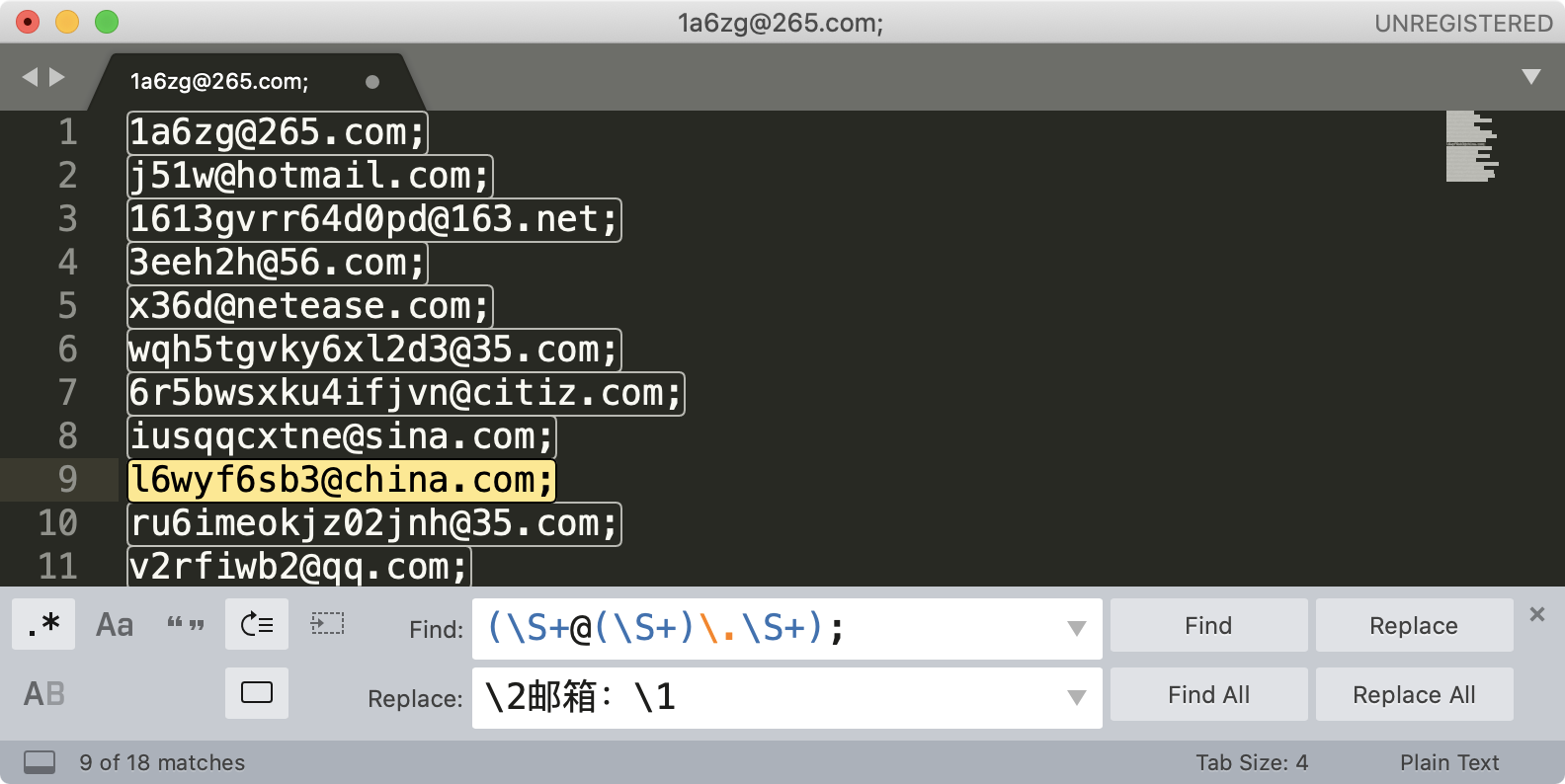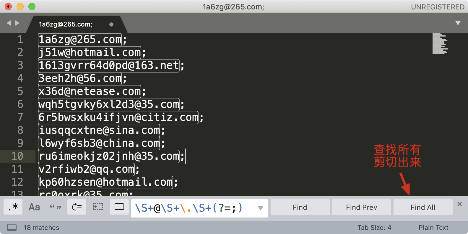 我们来尝试使用 sublime 提取文本中所有的邮箱地址,这里并不要求你写出一个完美的正则,因此演示时,使用\S+@\S+.\S+ 这个正则。另外我们可以加上环视,去掉尾部的分号。你可以在这里随机生成一些邮箱用于测试。