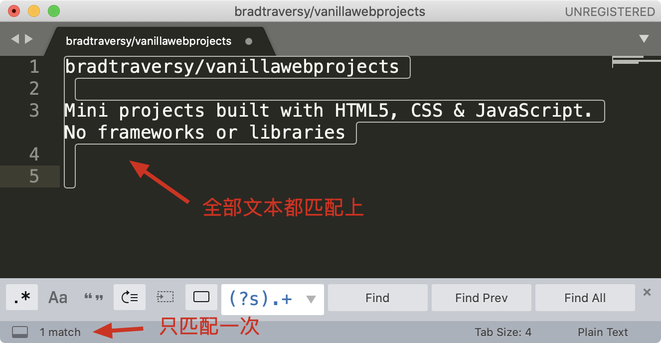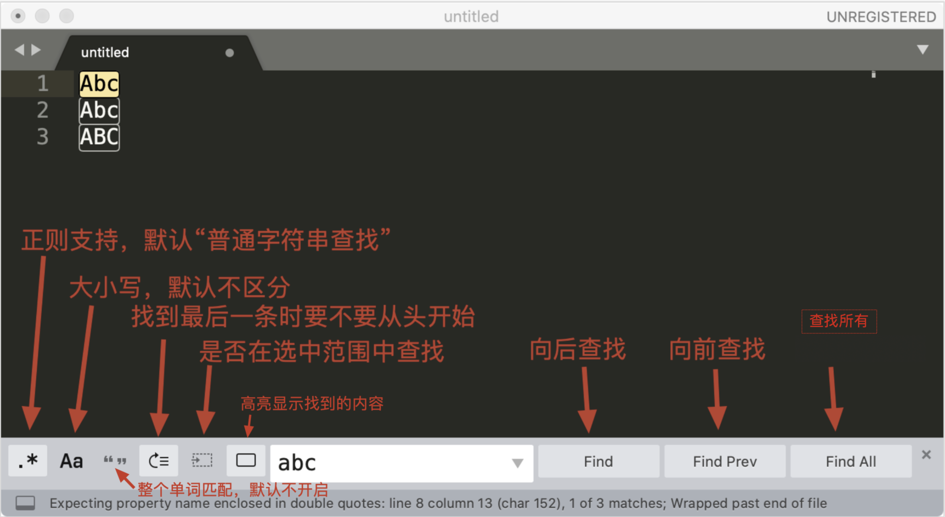 我以编辑器 Sublime Text 3 为例来进行讲解,下图是编辑器 Sublime Text 查找界面的介绍。