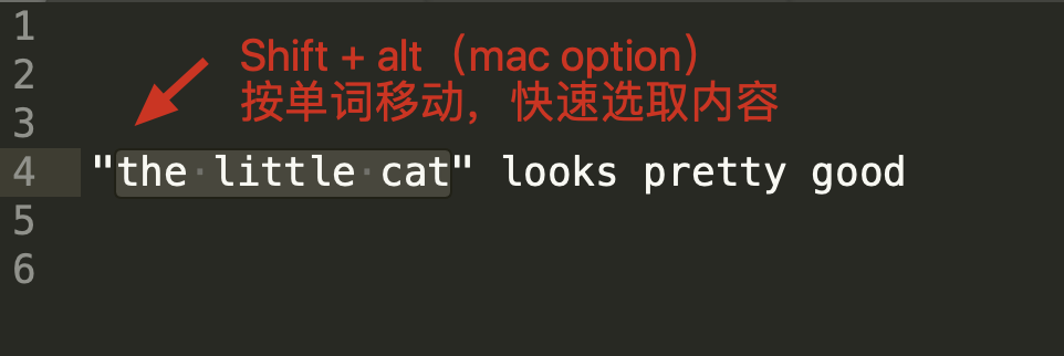 在常见的编辑器、IDE、甚至Chrome等浏览器中,我们编辑文本时,使用键盘的左右箭头移动光标,可以按住Shift键来选中文本。在左右移动时,如果你按住Alt(macOS的option),你会发现光标可以“按块移动”,快速移动到下一个单词。两种方式组合起来,你可以快速选择引号里面的内容。-