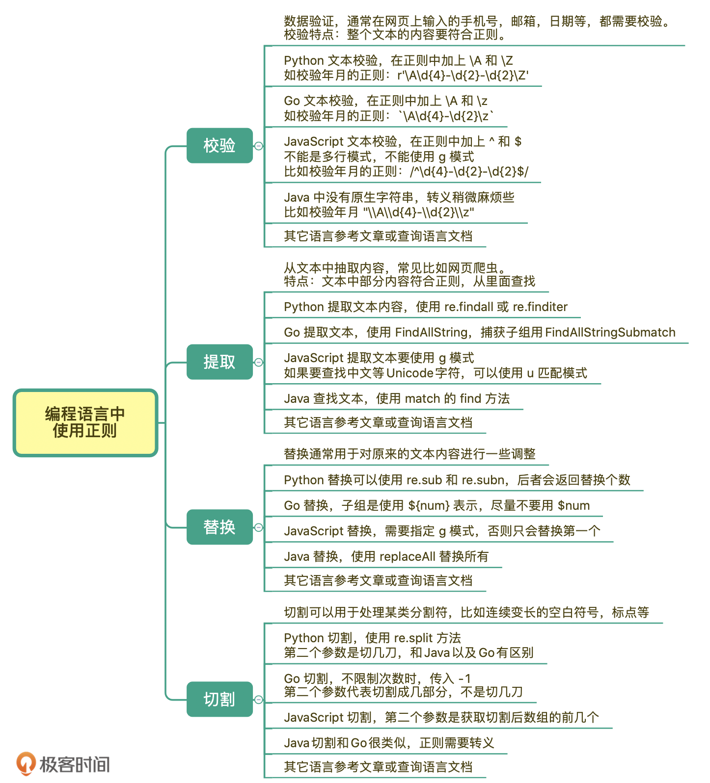 在进行文本处理时,正则解决的问题大概可以分成四类,分别是校验文本内容、提取文本内容、替换文本内容、切割文本内容。在这一节里,我会从功能分类出发,给你讲解在一些常见的编程语言中,如何正确地实现这些功能。