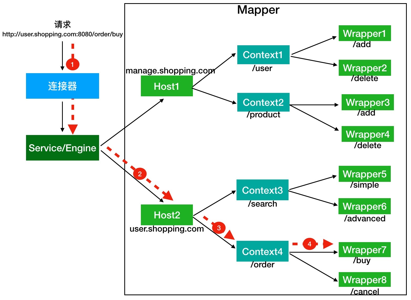 Service和Engine确定后,Mapper组件通过URL中的域名去查找相应的Host容器,比如例子中的URL访问的域名是user.shopping.com,因此Mapper会找到Host2这个容器。