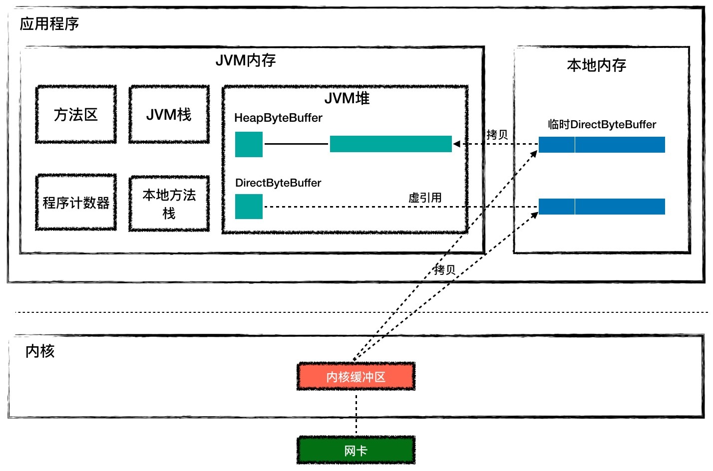 如果使用HeapByteBuffer,你会发现JVM堆和内核之间多了一层中转,而DirectByteBuffer用来解决这个问题,DirectByteBuffer对象本身在JVM堆上,但是它持有的字节数组不是从JVM堆上分配的,而是从本地内存分配的。DirectByteBuffer对象中有个long类型字段address,记录着本地内存的地址,这样在接收数据的时候,直接把这个本地内存地址传递给C程序,C程序会将网络数据从内核拷贝到这个本地内存,JVM可以直接读取这个本地内存,这种方式比HeapByteBuffer少了一次拷贝,因此一般来说它的速度会比HeapByteBuffer快好几倍。你可以通过上面的图加深理解。