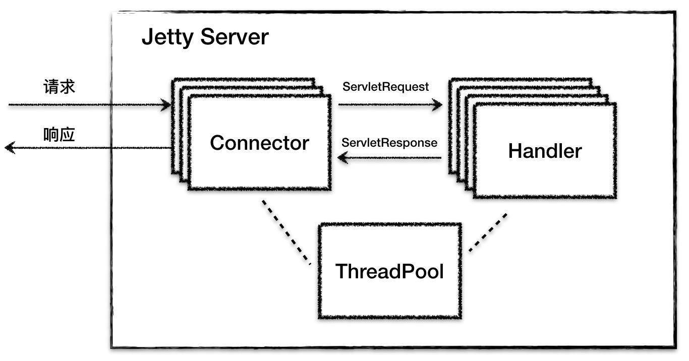 我在前面的专栏里介绍了Jetty的总体架构设计,简单回顾一下,Jetty总体上是由一系列Connector、一系列Handler和一个ThreadPool组成,它们的关系如下图所示:
