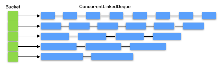 从上面的代码我们看到,ByteBufferPool是用不同的桶(Bucket)来管理不同长度的ByteBuffer,因为我们可能需要分配一块1024字节的Buffer,也可能需要一块64K字节的Buffer。而桶的内部用一个ConcurrentLinkedDeque来放置ByteBuffer对象的引用。