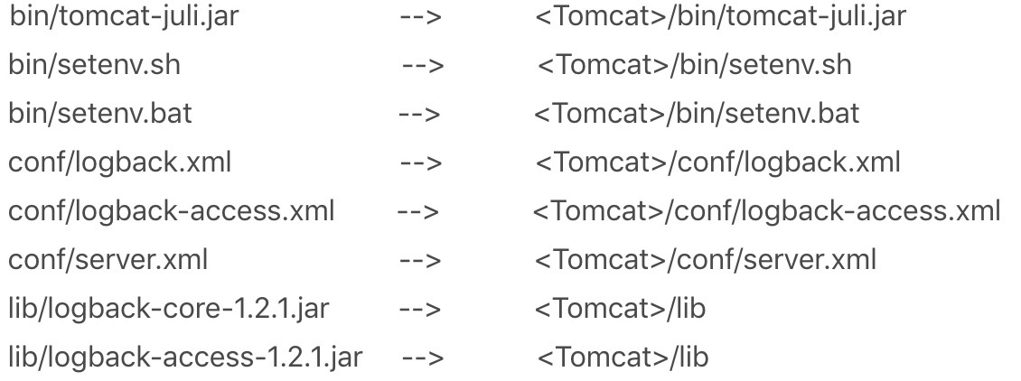 1.根据你的Tomcat版本,从这里下载所需要文件。解压后你会看到一个类似于Tomcat目录结构的文件夹。- 2.替换或拷贝下列这些文件到Tomcat的安装目录: