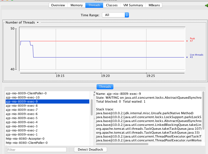 选择“线程”标签页,可以看到当前Tomcat进程中有多少线程,如下图所示:
